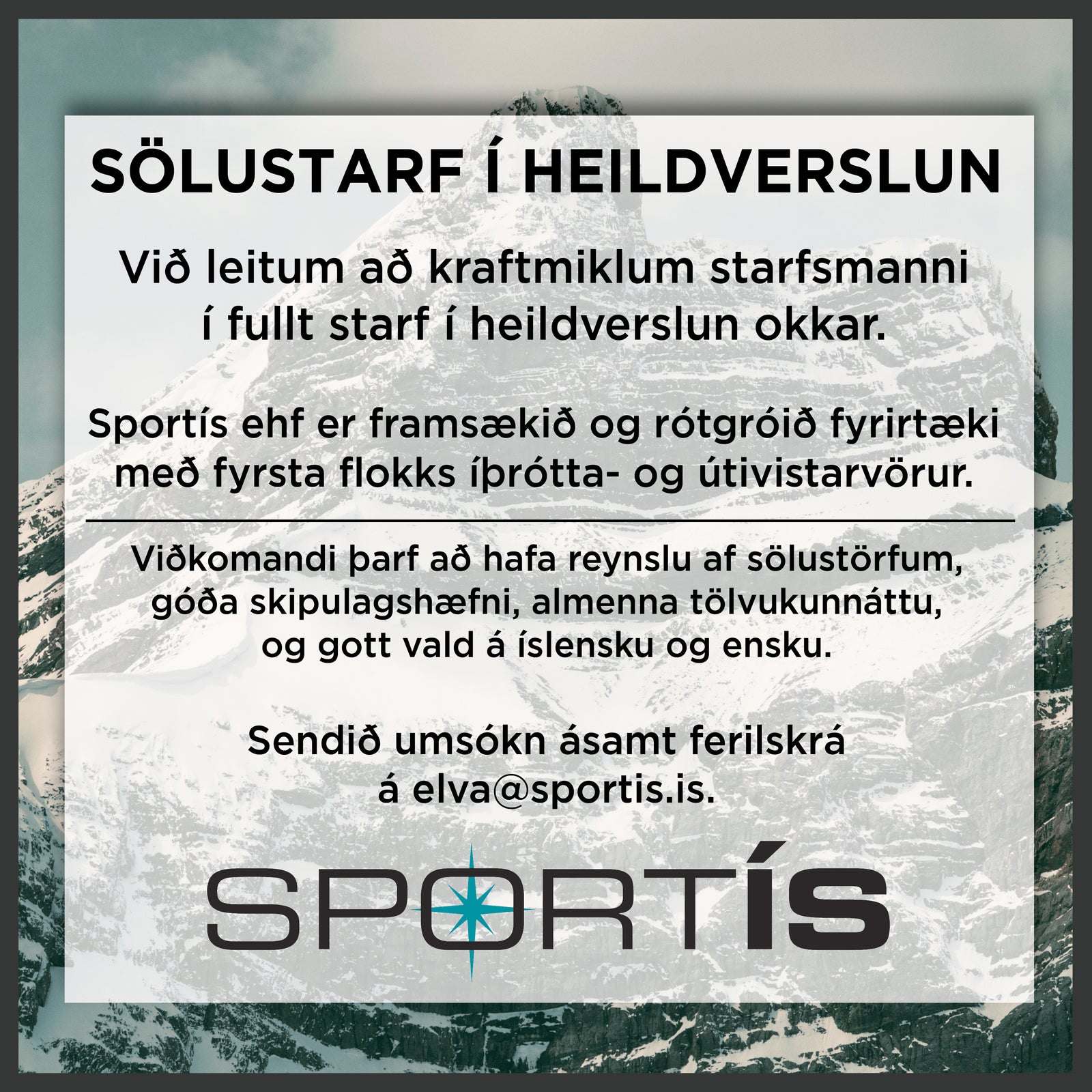 Viðkomandi þarf að hafa reynslu af sölustörfum, góða skipulagshæfni, almenna tölvukunnáttu, gott vald á íslensku og ensku.