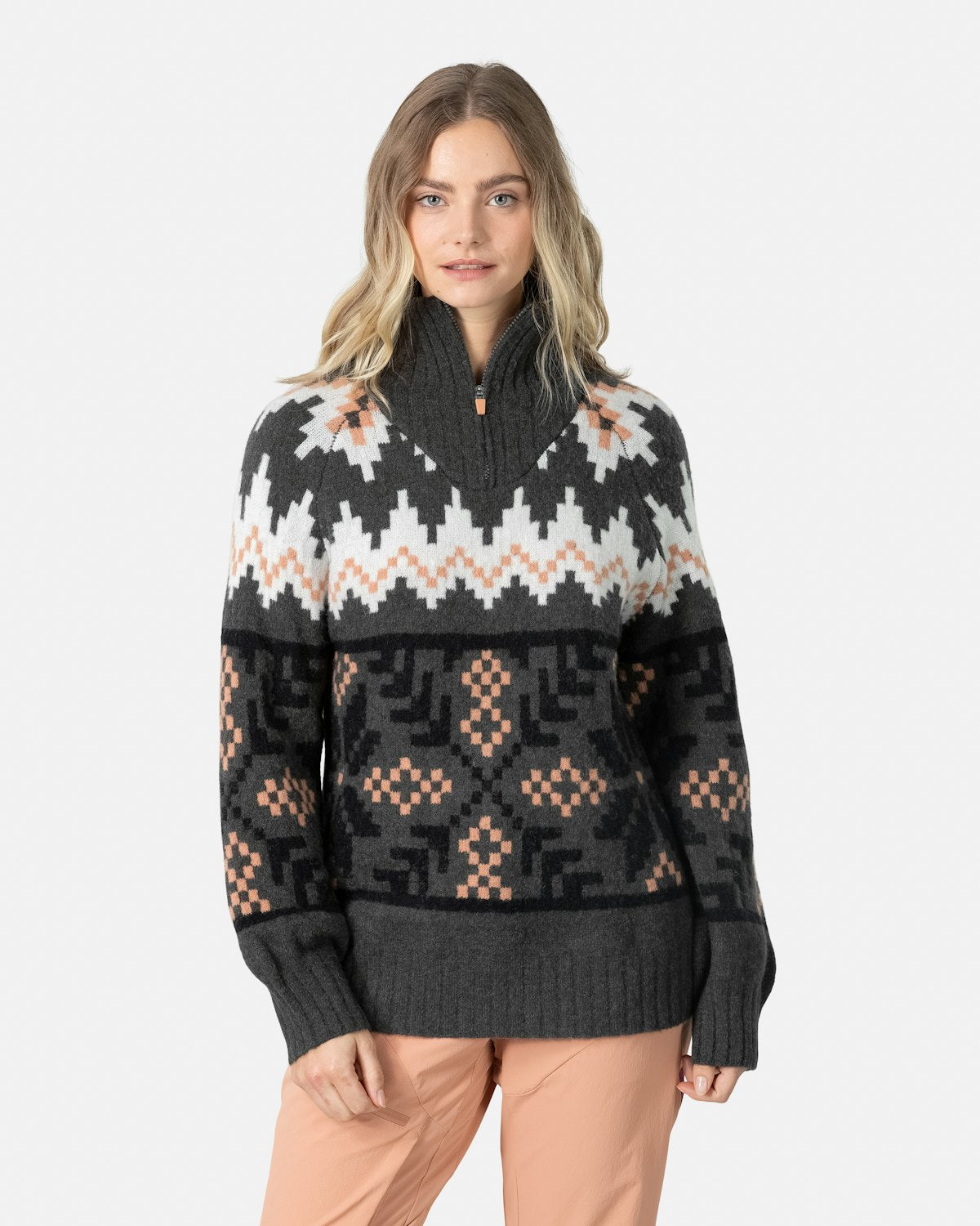 Hin glæsilega Amelia Knit peysa frá Kari Traa er vandlega hönnuð úr blöndu af ull og tilbúnu efni með mynstri innblásnu af Norður-Noregi.
